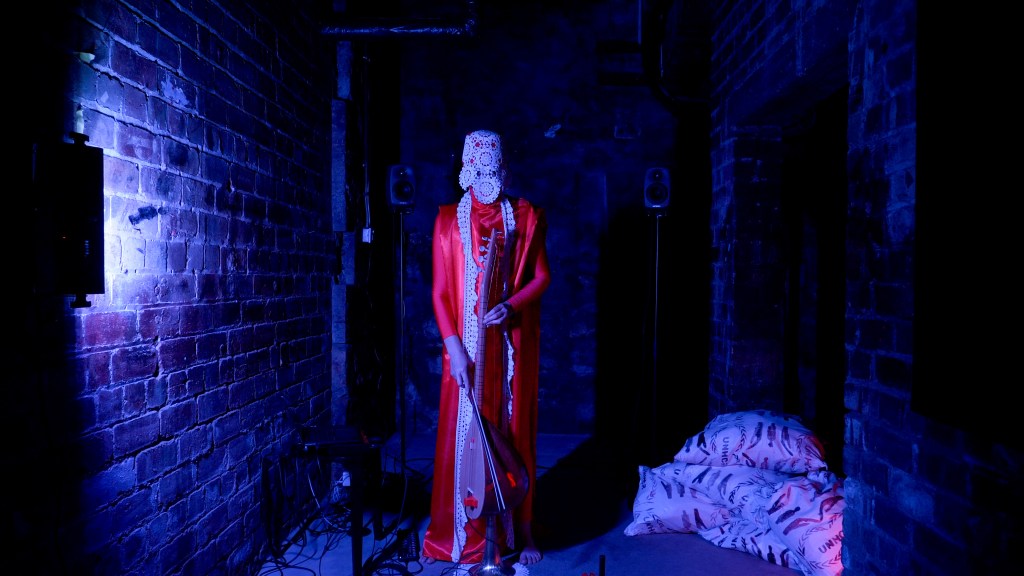 In the performance, Maja, wears a fez, a red cap usually worn by men, covered with donated lace from Bosnia and North Macedonia. She saws at a saz, a traditional stringed instrument originating in Turkey that, in the context of Bosnia- Herzegovina, her home country, is associated with sevdah folk music, focusing on themes of love and loss. Her atonal sawing of the instrument marks a rejection of the original purpose and the use of the saz as a readymade-style prop in the context of the performance.