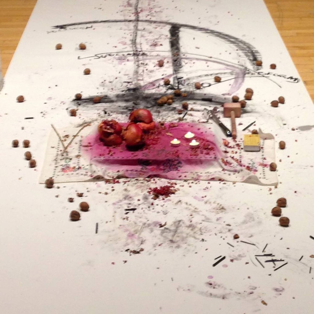 I am kneeling on a long, white piece of paper in a large venue. I am motionless. Different props are next to me. Chairs are on my left and right side. Doors open and the audience enters the room. I am looking straight to the wall opposite me waiting for a murmur to stop and people find the place to sit. I get up and take a large, heavy, chopping board. I also take a wooden meat hammer, and I hit the board three times. Next, I walk on the paper barefoot, kneel, draw with charcoal, and spill the soil sample brought from Sarajevo. I cover the soil with the chopping board. I roll pomegranates and walnuts on the paper. I destroy pomegranates slowly with knitting needles and meet hammer. I smash walnuts with the meat hammer. I smash my head into the debris of pomegranates and walnuts. I raise my head, gather the debris to the three piles by whispering the words “jedan, dva, tri” (one, two, three in Bosnian). Next, I burn a match and lighten up three candles. Finally, as I leave the room, lights go darker, and the sound is played from a loudspeaker positioned in proximity to the white paper. A field recording of the Muslim call for prayer and church bells ringing simultaneously in Sarajevo fills the room.