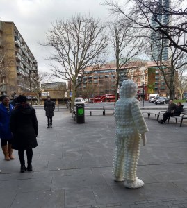 I found myself in one of the offices of London College of Communication, putting on a suit that I fashioned from soundproof white panels. Dressed as the Silencer, I became a character, not able to hear most sounds, or see clearly as the glasses easily steamed up, with limited capability to feel vibration or wind, due to the thickness of the suit. By leaving the building, Silencer encountered an unfamiliar terrain. The area of Elephant and Castle seemed a few hours ago very noisy, busy, overwhelming, but now it was very quiet. In the suit, I experienced a certain detachment from the environment. A full body experience of sound had been challenged, and it was clear that sound happens somewhere else. I was aware of the sources of only rare, very loud sound sources. Navigation in a maze of cycling lanes was difficult. The world is packed with information, and our minds are heavily selective. I was learning to navigate this new world as Silencer, to explore the area in silence, in an almost meditative state. People were waving at Silencer and taking pictures. We were interacting. After 2 hours of walk, Silencer went back to the University.